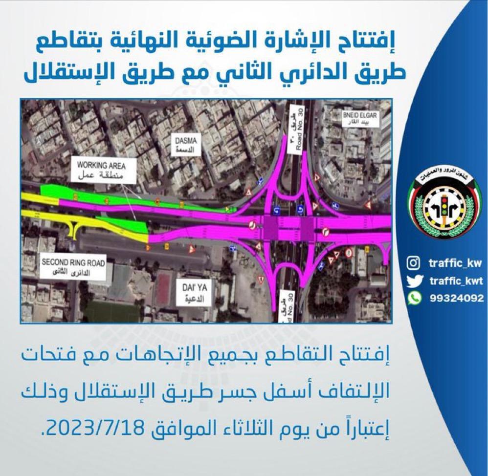 اعلنت الإدارة العامة للمرور عن افتتاح الإشارة الضوئية النهائية بتقاطع طريق الدائري الثاني مع طريق الاستقلال ( طريق 30 ) بجميع الاتجاهات مع فتحات الالتفاف أسفل جسر الاستقلال اعتبارا من يوم غد الثلاثاء الموافق 2023/7/18.