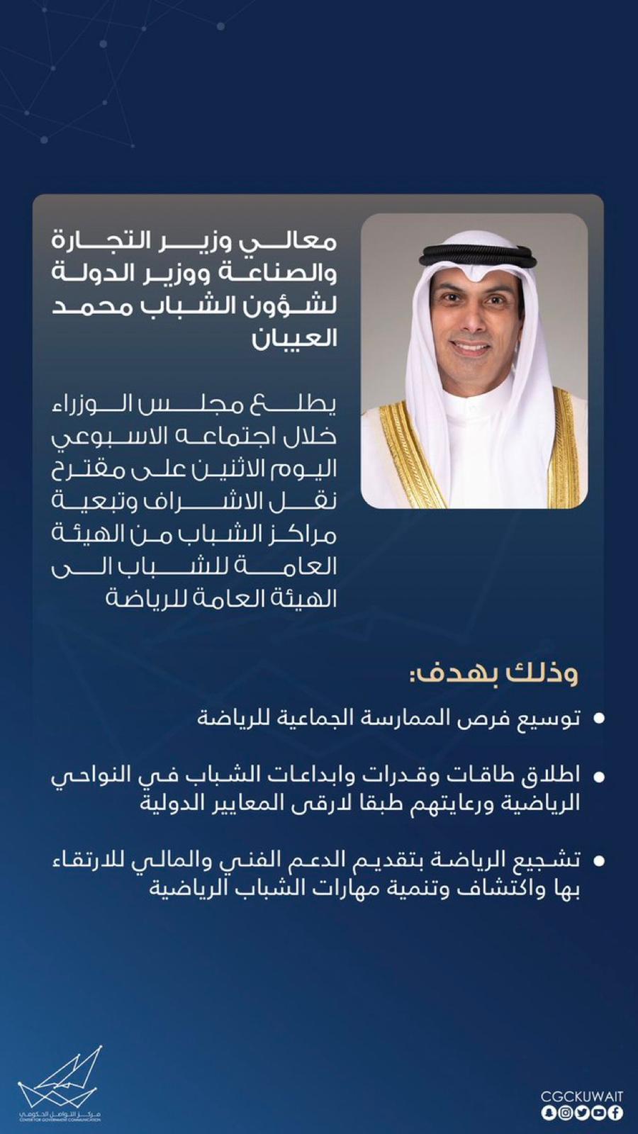 أطلع وزير التجارة والصناعة ووزير الدولة لشؤون الشباب محمد العيبان مجلس الوزراء خلال اجتماعه الاسبوعي اليوم الاثنين على مقترح نقل الاشراف وتبعية مراكز الشباب من الهيئة العامة للشباب الى الهيئة العامة للرياضة.