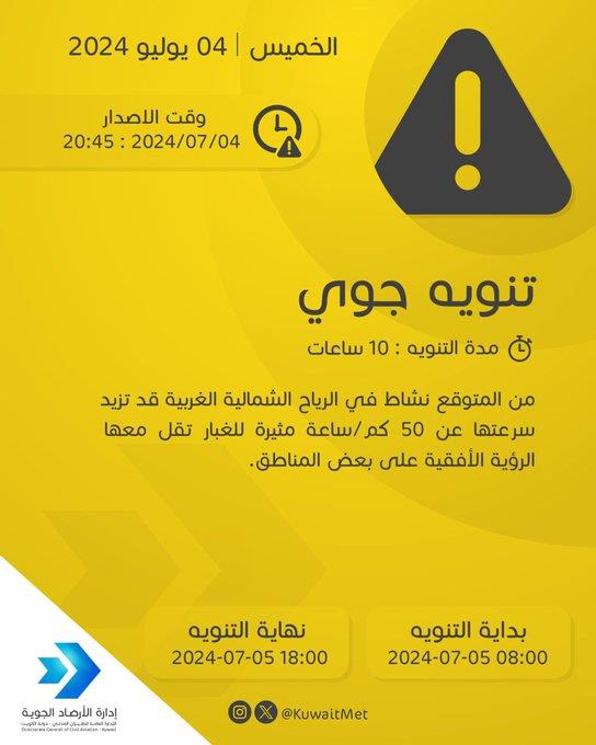 نوهت إدارة الأرصاد الجوية إلى أنه «من المتوقع حدوث نشاط في الرياح تزيد سرعتها عن 50 كم/ساعة مثيرة للغبار تقل معها الرؤية الأفقية على بعض المناطق.