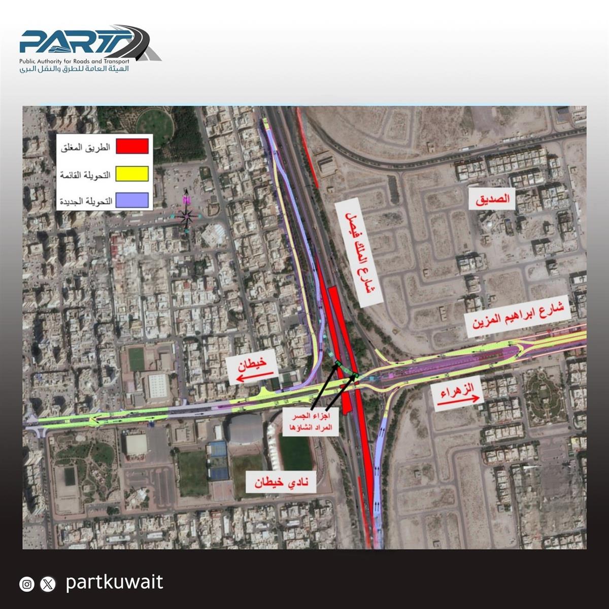 أعلنت الهيئة العامة للطرق والنقل البري بالتعاون مع الإدارة العامة للمرور عن إغلاق كامل مؤقت لشارع الملك فيصل عند تقاطع خيطان يومياً من الساعة 12:00 منتصف الليل وحتى 6:00 صباحاً ولمدة 9 أيام من تاريخ 11/07/2024 وحتى 20/07/2024 لأعمال إنشاء أجزاء الجسر العلوي أعلى تقاطع خيطان ويتم إستخدام التحويلة الجديدة للمرور المتجه الى المطار والى مدينة الكويت خلال مدة الإغلاق.
