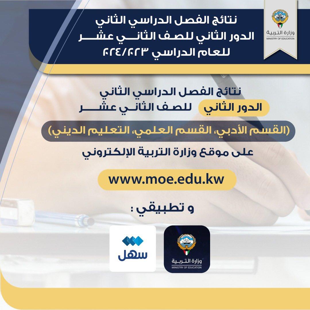 وأعلنت وزارة التربية أمس الجمعة نتائج الدور الثاني للصف الثاني عشر للعام الدراسي ٢٠٢٣-٢٠٢٤، موضحةً أن النتائج متاحة على الموقع الإلكتروني للوزارة moe.edu.kw، وكذلك على تطبيق وزارة التربية، وتطبيق سهل.