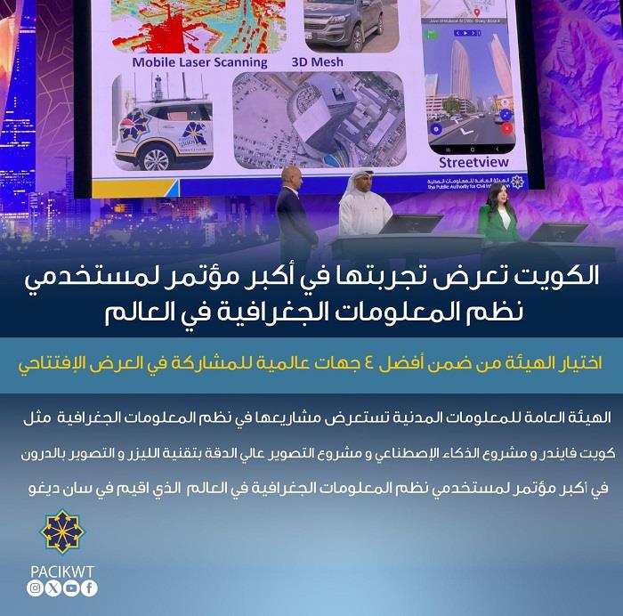 كونا - استعرضت الهيئة العامة للمعلومات المدنية مشاريعها الخاصة بنظم المعلومات الجغرافية خلال العرض الافتتاحي لأكبر مؤتمر عالمي لمستخدمي نظم المعلومات الجغرافية المنعقد حاليا في مدينة (سان دييغو) بالولايات المتحدة الأمريكية بحضور أكثر من 21 ألف مستخدم من مختلف دول العالم.