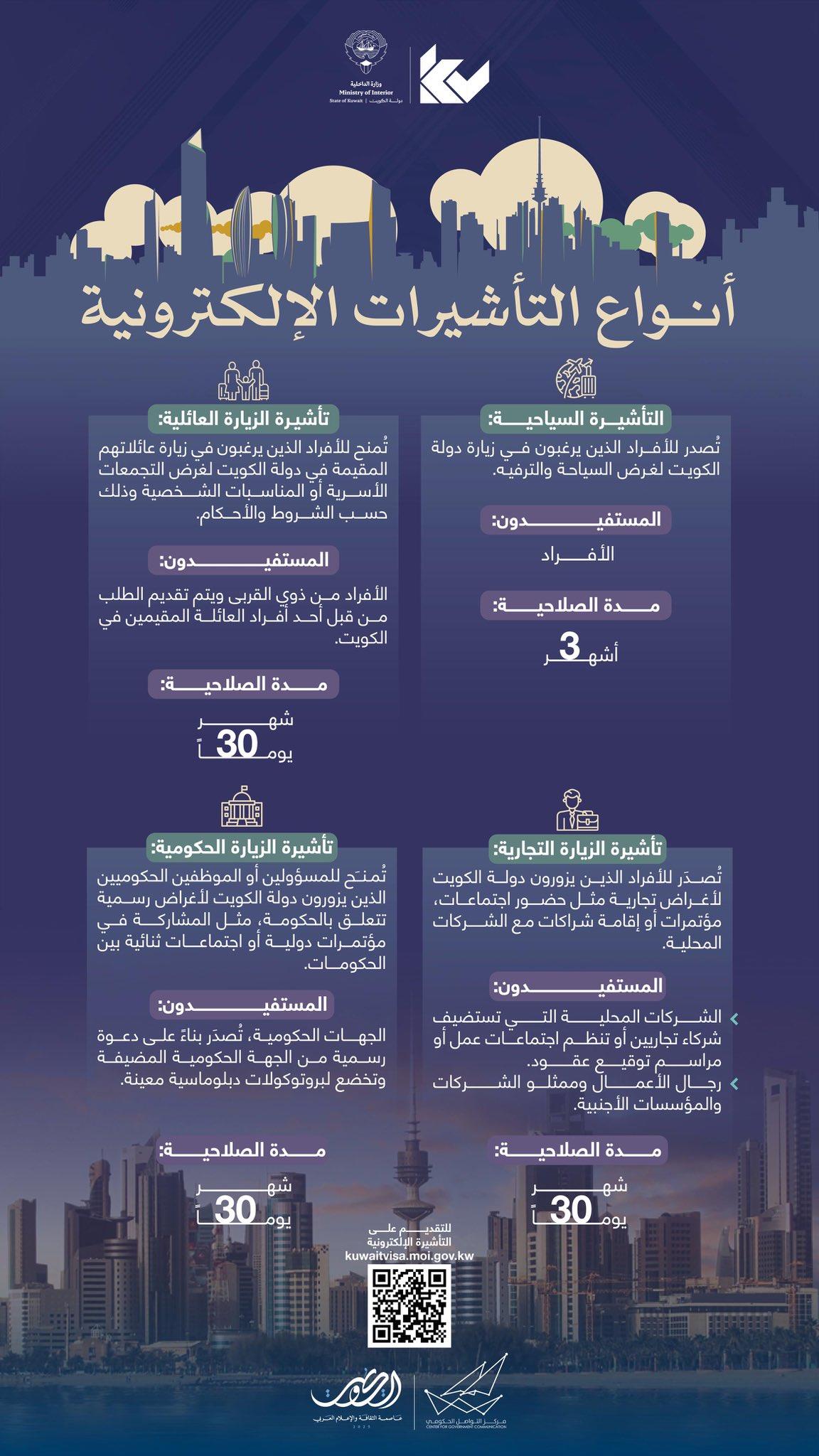 تأشيرة الزيارة العائلية: تمنح للأفراد الذين يرغبون في زيارة عائلاتهم المقيمة في الكويت لغرض التجمعات الأسرية أو المناسبات الشخصية. يتم تقديم الطلب من قبل أفراد العائلة المقيمين في الكويت، وتصل مدة صلاحيتها إلى 30 يومًا.