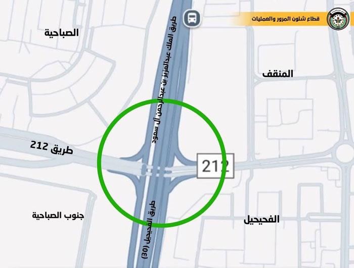 أعلنت الإدارة العامة للمرور أنه تم إفتتاح تقاطع نادي الفحيحيل على طريق 212 بالكامل من جميع الاتجاهات، بعد أن تم الانتهاء من أعمال الصيانة للطريق، وذلك في يوم السبت الموافق 2025/7/5 .