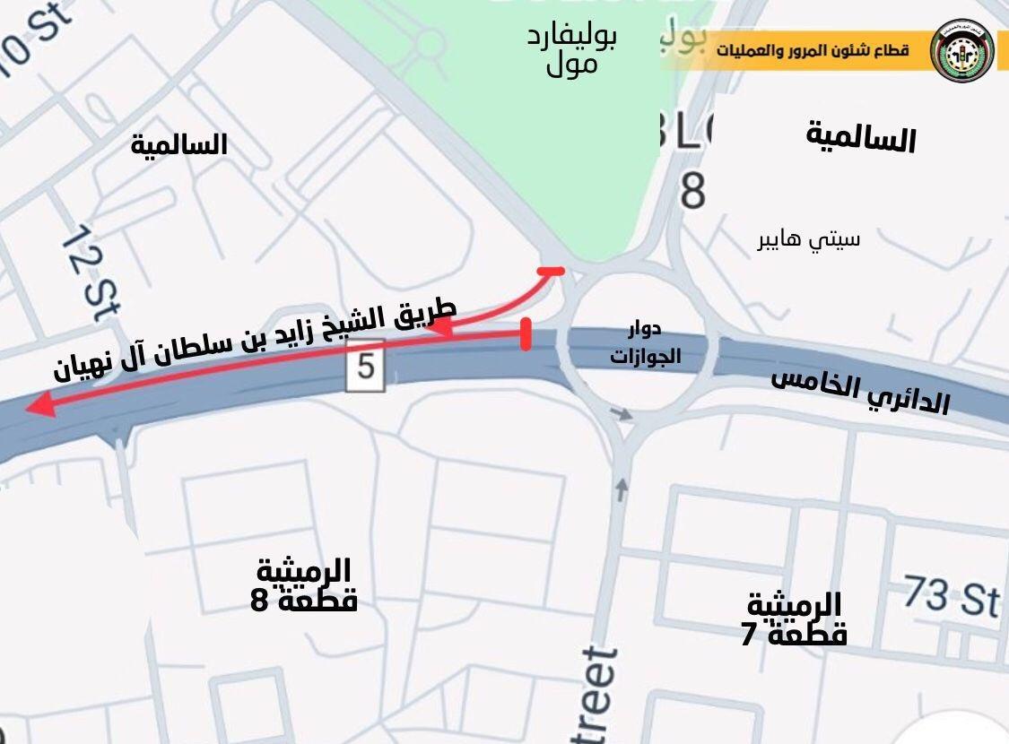 أعلنت الإدارة العامة للمرور عن إغلاق موقت لمخرج شارع المغيرة بن شعبة في منطقة السالمية، والمؤدي إلى طريق الشيخ زايد بن سلطان آل نهيان (الدائري الخامس) باتجاه الجهراء، وذلك اعتبارًا من يوم الخميس الموافق 10 يوليو 2025 وحتى فجر يوم الإثنين 14 يوليو 2025، وذلك ضمن خطة أعمال الصيانة الدورية.