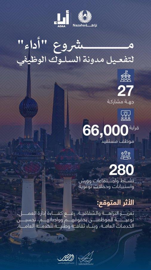 أطلقت نزاهة بالتعاون مع جهاز المراقبين الماليين مشروع "أداء" الهادف إلى تفعيل مدونة السلوك الوظيفي، بمشاركة 27 جهة حكومية، واستفادة نحو 66 ألف موظف.