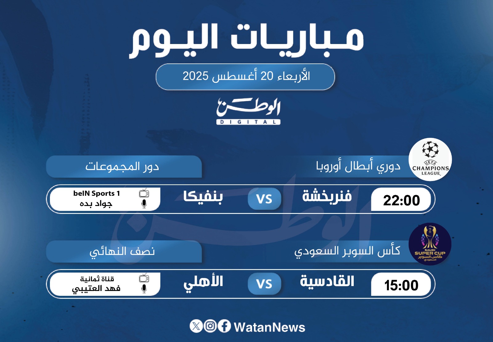 أبرز المباريات العربية والعالمية ليوم الأربعاء 20 أغسطس 2025