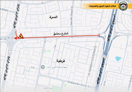 أعلنت الإدارة العامة للمرور عن إغلاق الحارة السريعة والوسطى على شارع دمشق بدايةً من تقاطع طريق الدائري الخامس بإتجاه طريق الدائري الرابع وذلك إعتباراً من مساء يوم الأحد الموافق 2025/08/24 وحتى يوم الأحد الموافق 2025/09/07.