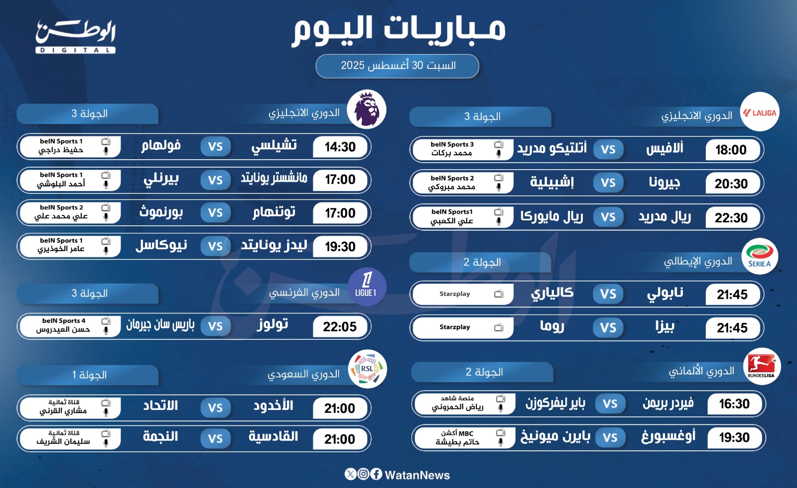 أبرز المباريات العربية والعالمية ليوم السبت 30 أغسطس 2025