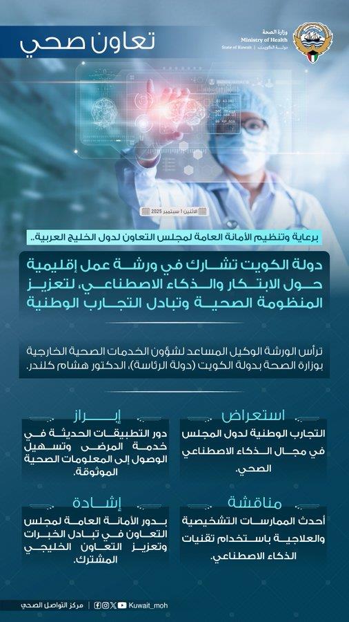 وترأس وفد الكويت في الورشة الوكيل المساعد لشؤون الخدمات الصحية الخارجية بوزارة الصحة، الدكتور هشام كلندر، حيث ناقش المشاركون أحدث الممارسات التقنية والتطبيقات العملية للذكاء الاصطناعي في تطوير الخدمات الطبية ورفع كفاءتها.
