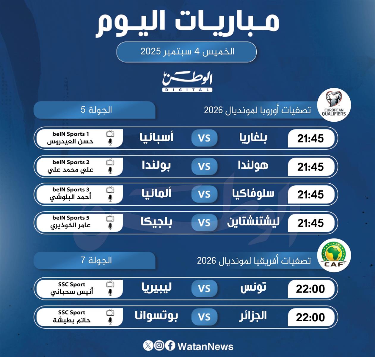 أبرز المباريات العالمية ليوم الخميس 4 سبتمبر 2025