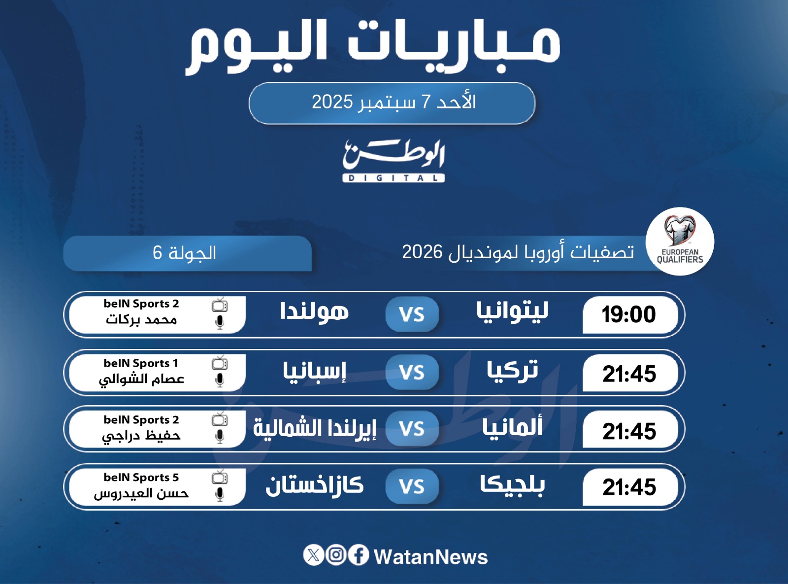تتواصل اليوم الأحد 7 سبتمبر 2025 منافسات الجولة السادسة من التصفيات الأوروبية المؤهلة إلى كأس العالم 2026، حيث سيكون عشاق الكرة الأوروبية على موعد مع عدد من المباريات المرتقبة التي قد تحمل الكثير من الإثارة والندية في صراع حجز بطاقات التأهل للمونديال.