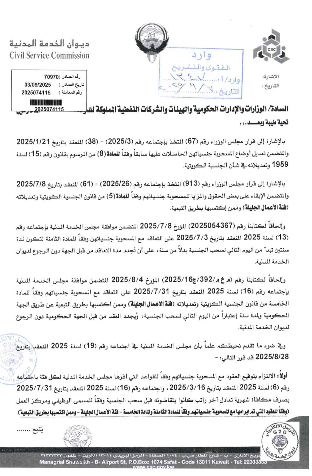 اعتمد ديوان الخدمة المدنية آلية التعاقد مع المسحوبة جنسياتهم وفقاً للمادة الخامسة من قانون الجنسية الكويتية وتعديلاته (فئة الاعمال الجليلة) وممن اكتسبها بطريق التبعية عن طريق الجهة الحكومية ولمدة سنة إعتباراً من اليوم التالي لسحب الجنسية، على أن يجدد العقد من قبل الجهة الحكومية دون الرجوع للديوان.
