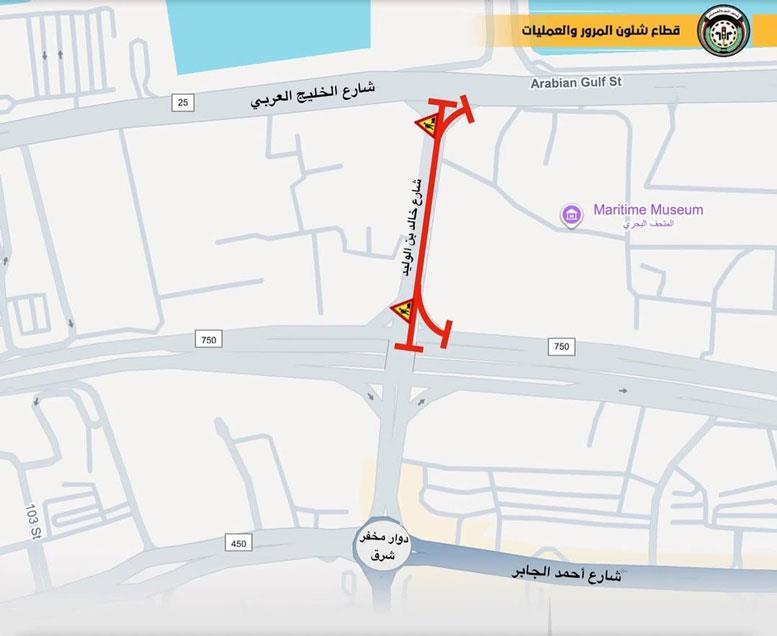 تعلن الإدارة العامة للمرور عن إغلاق جزئي لشارع خالد بن الوليد وإغلاق التقاطع للقادم من شارع أحمد الجابر باتجاه شارع الخليج العربي إعتباراً من يوم الأثنين الموافق 2025/09/08 وحتى يوم الجمعة الموافق 2025/09/12.
