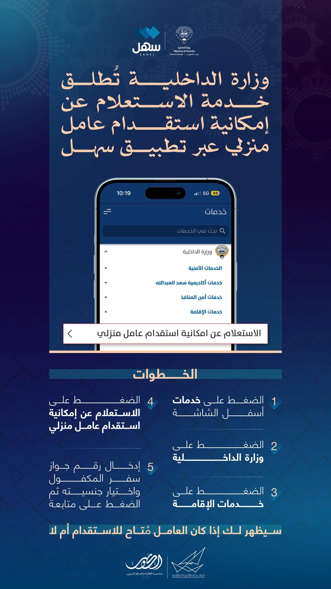 أطلقت وزارة الداخلية خدمة الاستعلام عن إمكانية استقدام عامل منزلي عبر تطبيق سهل.
