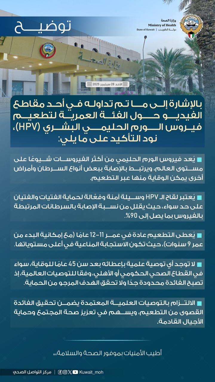 أكدت وزارة الصحة الكويتية في بيان توضيحي صدر اليوم الأحد 28 سبتمبر 2025 أن لقاح فيروس الورم الحليمي البشري (HPV) يعد وسيلة آمنة وفعّالة للوقاية من الفيروس واسع الانتشار عالميًا، والذي يرتبط بالإصابة بأنواع مختلفة من السرطان والأمراض الأخرى.